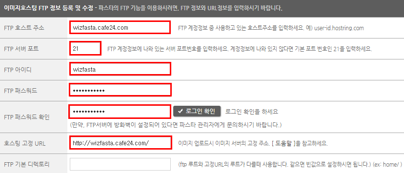 이미지호스팅 FTP 정보 등록 및 수정 항목에 신청한 내용대로 정확히 입력합니다.