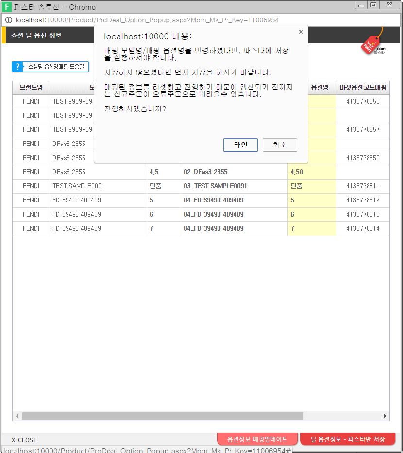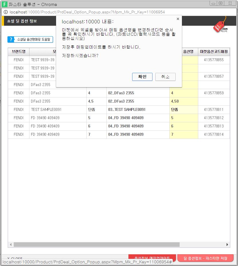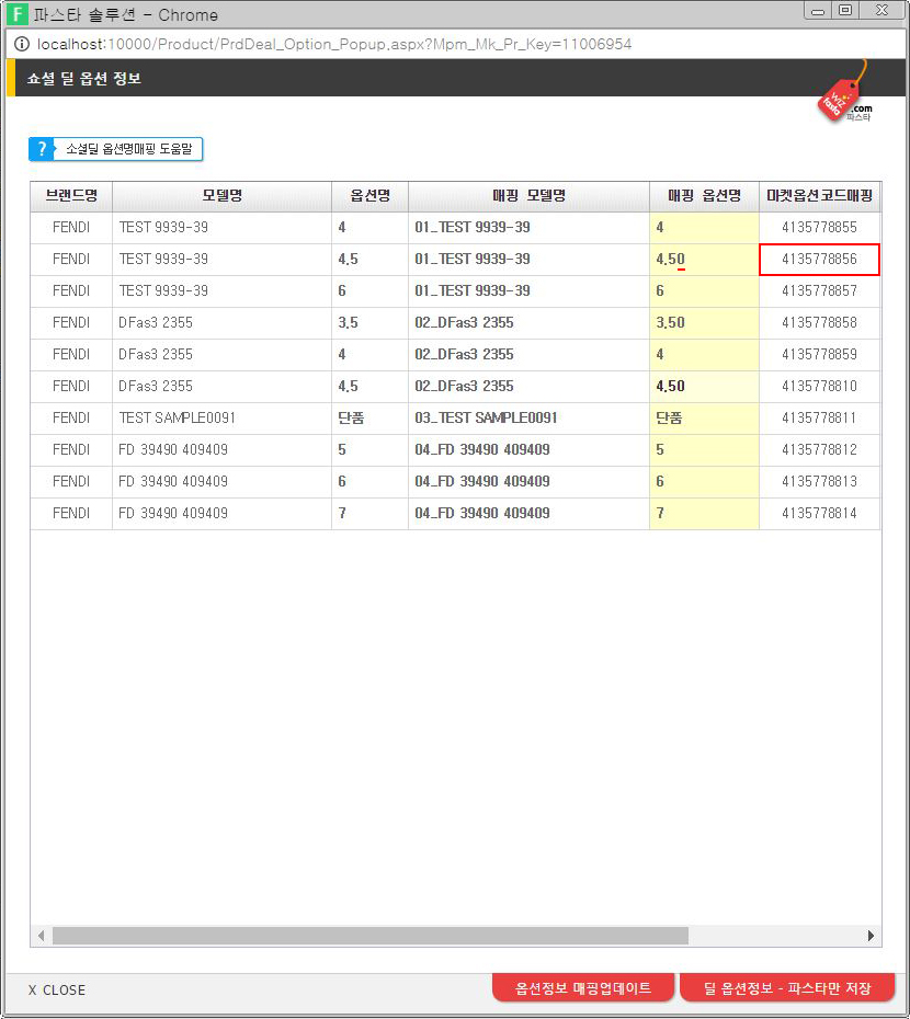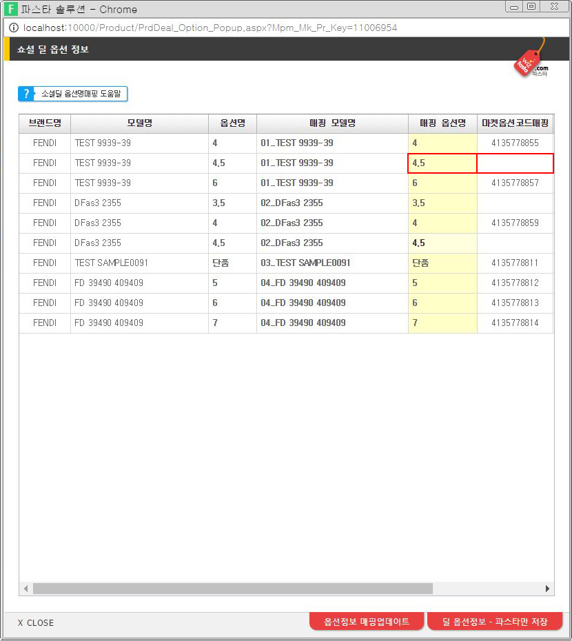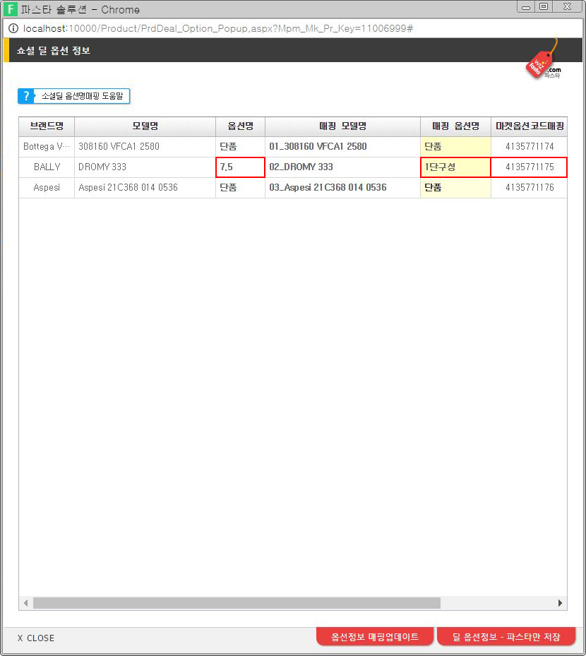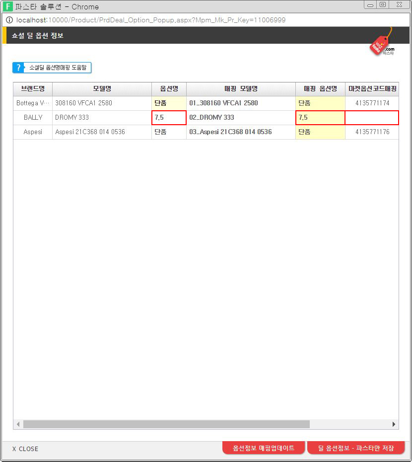 2) 매핑 옵션명에 소셜딜마켓에 변경된 옵션명을 저장 후 [딜 옵션정보 – 파스타만 저장] 버튼을 클릭합니다.