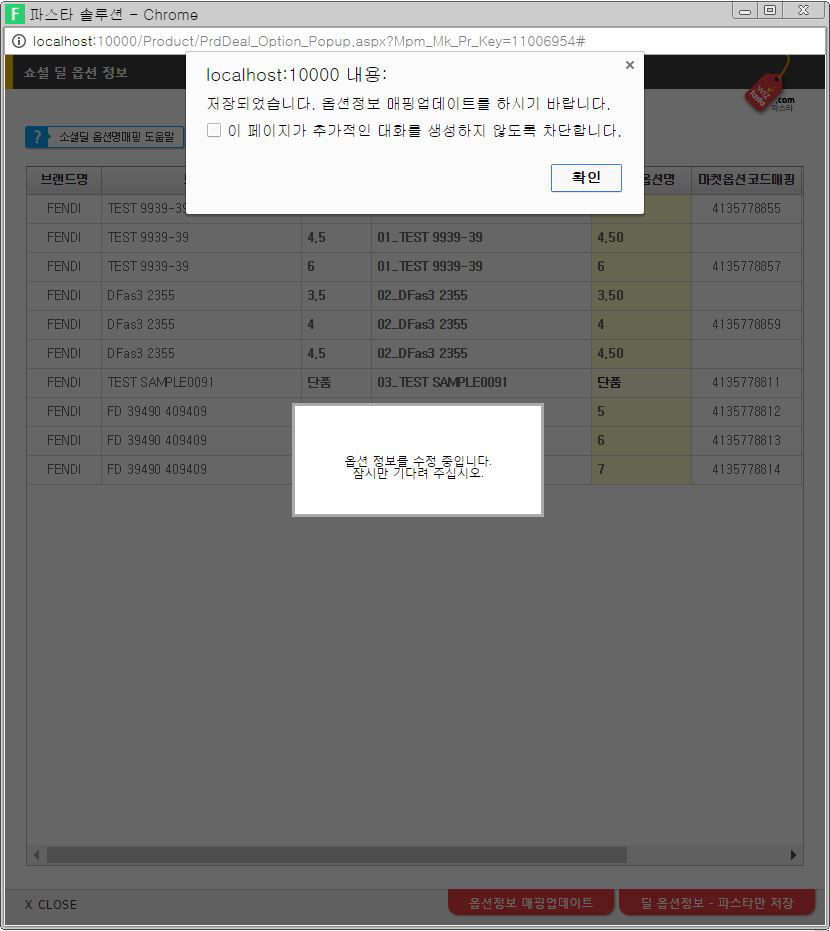 [딜 옵션정보 – 파스타만 저장] 버튼을 클릭 파스타서버에 먼저 저장을 합니다.